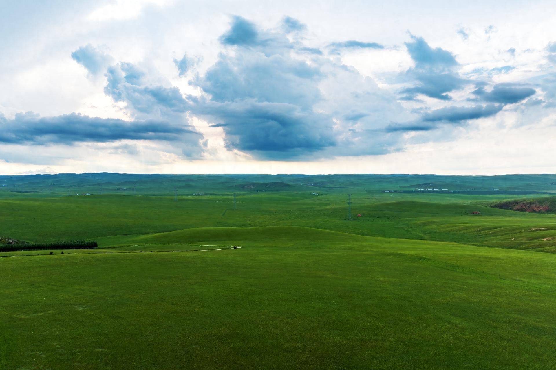 草原的碧绿与天空的湛蓝在天际交融,成群的牛羊如珍珠般散落在无边的绿毯上。