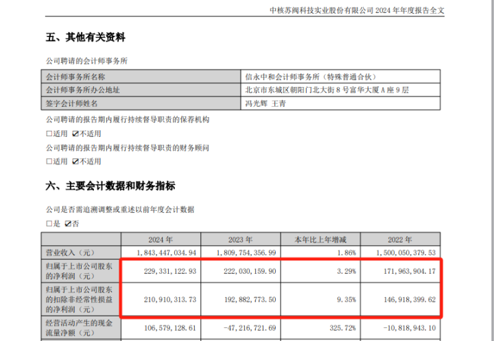 2022年至2024年及2025年第一季度,中核科技的归母净利润分别为1.72亿元、2.22亿元、2.29亿元及180.64万元,扣非后净利润分别为1.47亿元、1.93亿元、2.11亿元及24.27万元。