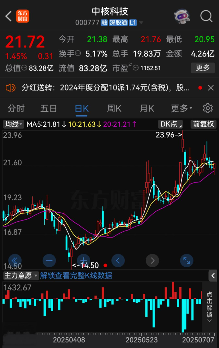 截至7月7日收盘,中核科技股价报21.72元/股,总市值为83.28亿元。
